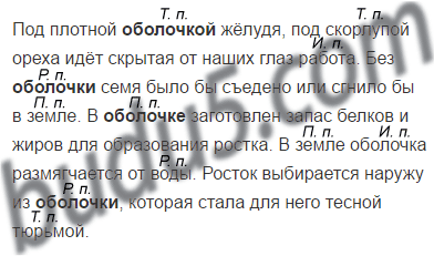Под плотной (оболочка) жёлудя, под скорлупой ореха идёт скрытая от наших глаз работа. Без (оболочка) семя было бы съедено или сгнило бы в земле. В (оболочка) заготовлен запас белков и жиров для образования ростка. В земле оболочка размягчается от воды. Росток выбирается наружу из (оболочка), которая стала для него тесной тюрьмой.